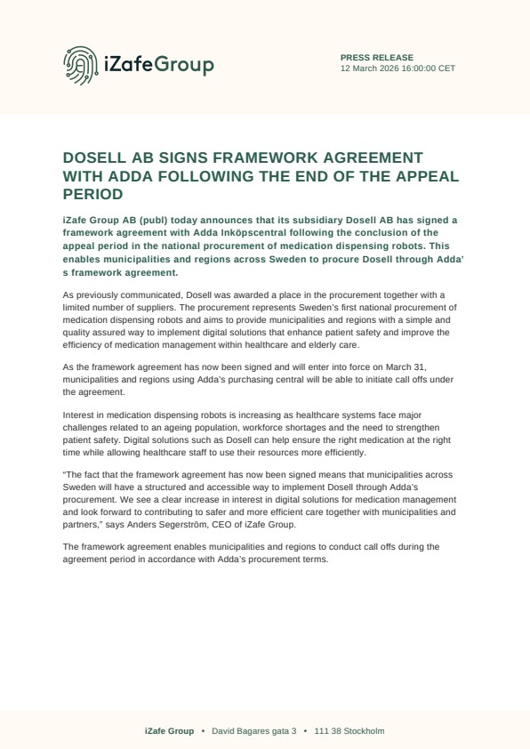 iZafe Group AB (publ) today announces that its subsidiary Dosell AB has signed a framework agreement with Adda Inköpscentral following the conclusion of the appeal period in the national procurement of medication dispensing robots. This enables municipalities and regions across Sweden to procure Dosell through Adda’s framework agreement.