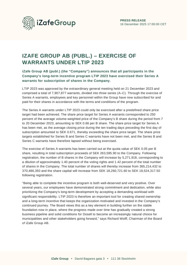 iZafe Group AB (publ.) (the “Company”) announces that all participants in the Company’s long-term incentive program LTIP 2023 have exercised their Series A warrants for subscription of shares in the Company.