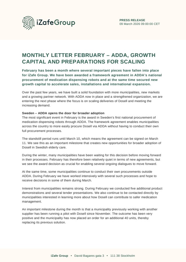 February has been a month where several important pieces have fallen into place for iZafe Group. We have been awarded a framework agreement in ADDA’s national procurement of medication dispensing robots and at the same time secured new growth capital to accelerate sales, installations and international expansion.