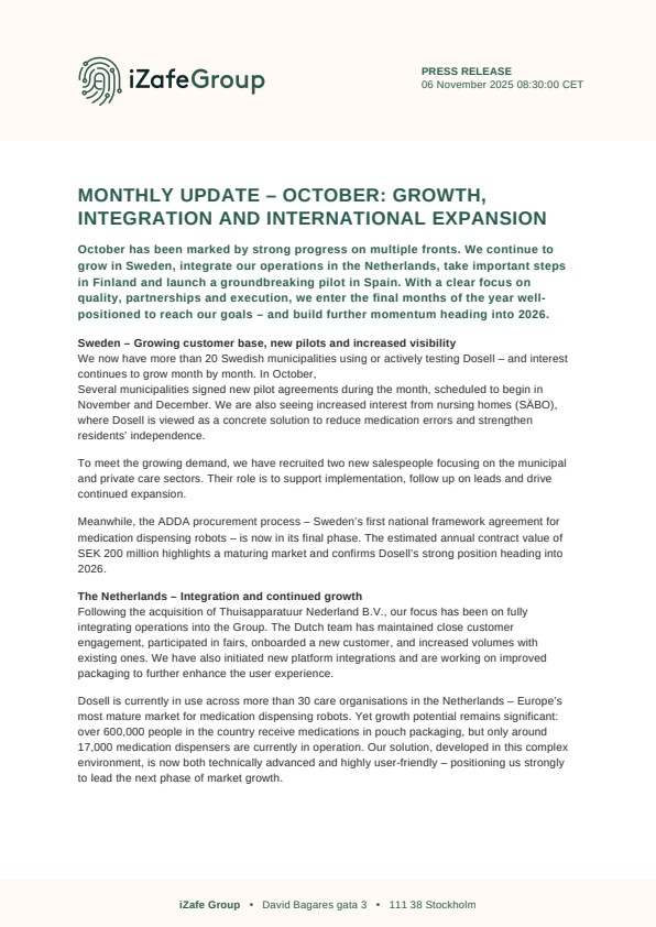 Several municipalities signed new pilot agreements during the month, scheduled to begin in November and December. We are also seeing increased interest from nursing homes (SÄBO), where Dosell is viewed as a concrete solution to reduce medication errors and strengthen residents’ independence.