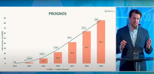 iZafe Groups VD Anders Segerström presenterade bolaget på Aktiespararnas evenemang Stora Aktiedagarna. Under presentationen lyfte Anders Segerström fram bolagets starka framtidsutsikter, med en prognos som visar att de årliga återkommande intäkterna (ARR) förväntas öka från 0,3 MSEK 2023 till 85,5 MSEK 2029.