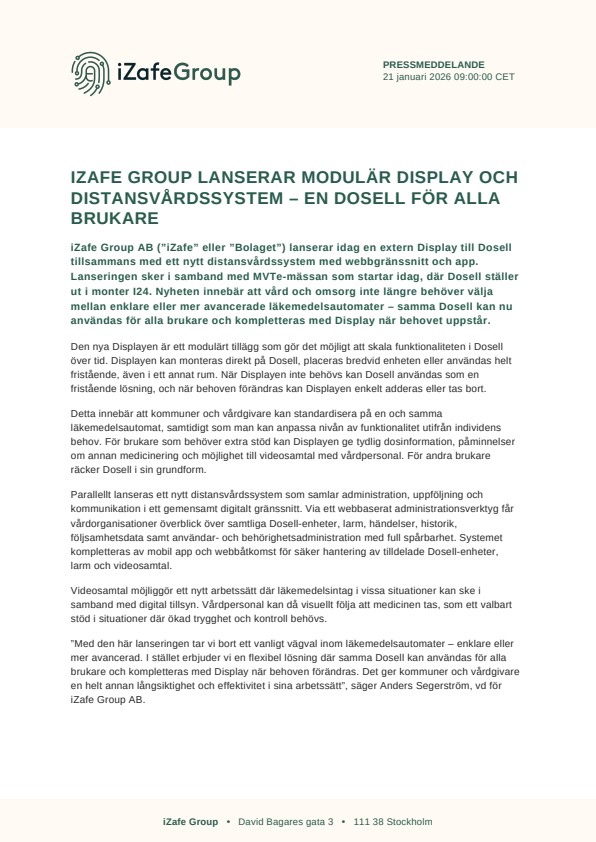 iZafe Group AB (”iZafe” eller ”Bolaget”) lanserar idag en extern Display till Dosell tillsammans med ett nytt distansvårdssystem med webbgränssnitt och app. Lanseringen sker i samband med MVTe-mässan som startar idag, där Dosell ställer ut i monter I24. Nyheten innebär att vård och omsorg inte längre behöver välja mellan enklare eller mer avancerade läkemedelsautomater – samma Dosell kan nu användas för alla brukare och kompletteras med Display när behovet uppstår.