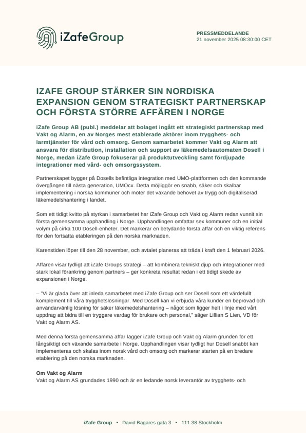 iZafe Group AB (publ.) meddelar att bolaget ingått ett strategiskt partnerskap med Vakt og Alarm, en av Norges mest etablerade aktörer inom trygghets- och larmtjänster för vård och omsorg. Genom samarbetet kommer Vakt og Alarm att ansvara för distribution, installation och support av läkemedelsautomaten Dosell i Norge, medan iZafe Group fokuserar på produktutveckling samt fördjupade integrationer med vård- och omsorgssystem.
